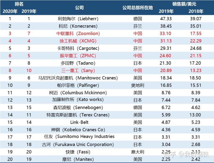 從排名來(lái)看,利勃海爾、科尼、中聯(lián)重科位列前三。中國有4家企業(yè)上榜,分別是中聯(lián)重科、徐工機械、上海振華重工和三一重工,分別位列第3、4、6、8名。其中,中聯(lián)重科排名較2019年上升了4名,三一重工排名上升了2名,徐工機械排名保持不變,上海振華重工排名下降了1名。